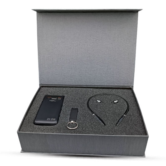 جعبه شماره 22 با محصولات هندزفری گردنی و پاوربانک و فلش